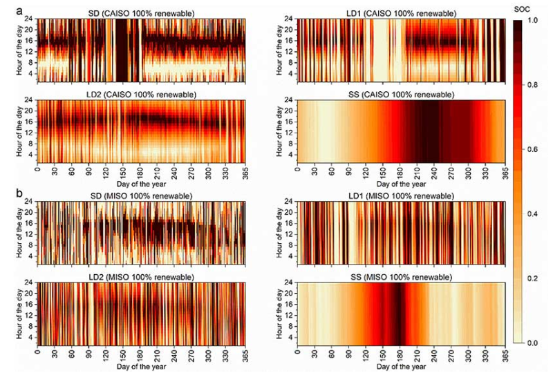 加州獨立系統(tǒng)運營商(CAISO)和美國中大陸?yīng)毩⑾到y(tǒng)運營商(MISO)中短期儲能系統(tǒng)(SD)、長時儲能系統(tǒng)(LD1和LD2)和季節(jié)性儲能系統(tǒng)(SS)的荷電狀態(tài)(SOC)。(a)CAISO具有100%可再生能源組合設(shè)備的標(biāo)準(zhǔn)化SOC。(b) MISO具有100%可再生能源組合設(shè)備的標(biāo)準(zhǔn)化SOC。SOC=1(深紅色)表示儲能系統(tǒng)已充滿。SOC=0(淺紅色)表示儲能設(shè)備為空。