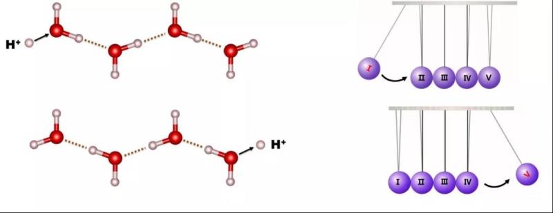 格羅特斯機(jī)理講的是在水或者酸中,質(zhì)子傳到的機(jī)理。格羅特斯在1805年提出這個(gè)機(jī)理,原文用拉丁文在羅馬發(fā)表,在1806年被翻譯成法文?,F(xiàn)在能看到的版本是1806年的法文版本。和格羅特斯機(jī)理相對(duì)應(yīng)的離子傳導(dǎo)機(jī)理是車輛機(jī)理。車輛機(jī)理很好理解。比如一個(gè)鋰離子在水溶液里,鋰離子要從溶液中的A點(diǎn)移動(dòng)到B點(diǎn),這個(gè)鋰離子自己會(huì)被一群水分子簇?fù)碇苿?dòng)過(guò)去,是一種離子親力親為的感覺(jué)。但是格羅特斯機(jī)理中質(zhì)子在水里的傳導(dǎo),傳導(dǎo)的不是質(zhì)子本身,而是它的電荷。在水里,水分子們通過(guò)氫鍵連成一個(gè)網(wǎng)絡(luò)。質(zhì)子的傳導(dǎo),就靠著“手拉著手”的水分子之間的“手臂”震動(dòng),就實(shí)現(xiàn)了??梢韵胂笠幌?,一排舞者,手拉著手站好,從一端開(kāi)始,依次做霹靂舞的過(guò)電動(dòng)作,形成一個(gè)手臂的波浪,就這樣完成了質(zhì)子的傳導(dǎo)。這就好比是水分子內(nèi)部氫氧鍵的震動(dòng)。質(zhì)子接上水分子鏈的一端,震動(dòng)之后,在水分子鏈的另一端,另一個(gè)質(zhì)子,就被釋放出來(lái)了,這樣就完成的質(zhì)子的傳導(dǎo)(圖9左)。這個(gè)過(guò)程和牛頓擺也很相似(圖9右)。這種傳輸質(zhì)子的過(guò)程,最大的特點(diǎn)就是快。筆者的課題組最近將這個(gè)機(jī)理應(yīng)用到了以質(zhì)子作為離子載流子的電池中。電池的充放電可以異常的快[]。