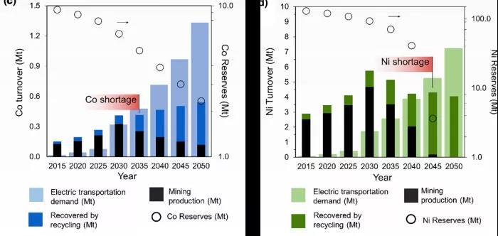 我們首先談?wù)勆厦婀降姆肿又械碾姵卦O(shè)備的購(gòu)入成本。這個(gè)成本取決于電池的制造成本。電池制造所使用的材料最好是來(lái)自地殼中富集的元素,如巖石構(gòu)成組分,比如鈉,鎂,鋁,鐵,錳,碳,硅,氧,硫等等。使用這些元素具有可持續(xù)性的優(yōu)勢(shì)。而且會(huì)受益于規(guī)?;?yīng),即生產(chǎn)的越多,成本會(huì)越低。而如果采用貴重金屬或者較為稀有的元素,就會(huì)造成生產(chǎn)地越多,這些元素的供應(yīng)就越緊張,導(dǎo)致生成相關(guān)產(chǎn)品的成本會(huì)越高,從而最終會(huì)失去市場(chǎng)的競(jìng)爭(zhēng)力。值得注意的是鋰電池里面經(jīng)常用的元素大部分都不是構(gòu)成巖石的元素。鋰電池正極中的鈷、鎳的供應(yīng)都可能會(huì)出現(xiàn)問(wèn)題。以目前的發(fā)展態(tài)勢(shì),在2035年會(huì)出現(xiàn)鈷的短缺,在2045年出現(xiàn)鎳的短缺[](圖7,8)。世界上鈷資源主要在剛果,占到世界總儲(chǔ)量的58.8%, 排在第二的是俄羅斯,5.14%。而中國(guó)連前12名都不在,第十二名是美國(guó):0.6%。中國(guó)的優(yōu)勢(shì)是全球90%的鈷產(chǎn)品出自中國(guó)。