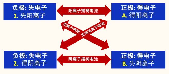 那么我們可以為上邊的正極和負(fù)極的工作原理配對(duì)了 (如圖6所示)。這是一個(gè)二乘二的問(wèn)題。一共四種情況。情況甲:如果是負(fù)極選(1)讓陽(yáng)離子自行離開(kāi),正極如果選擇方案(A)接納陽(yáng)離子,來(lái)維持電中性,這種情況就是陽(yáng)離子搖椅電池,包括鋰離子電池的工作原理。情況乙:如果負(fù)極選擇(1)讓陽(yáng)離子自行離開(kāi), 正極如果選擇方案(B)讓陰離子自己走,進(jìn)入電解質(zhì)中,這是雙離子電池,或者叫手風(fēng)琴電池的工作原理。這種情況,電解質(zhì)中會(huì)出現(xiàn)相同電荷的陽(yáng)離子和陰離子,這樣電解質(zhì)就變濃了。情況丙:負(fù)極選(2)接納陰離子,而正極選擇(A)接納陽(yáng)離子,這種情況是我實(shí)驗(yàn)室在2019年最早命名的反向雙離子電池。最后是情況丁:負(fù)極選擇(2)接納陰離子,而正極選擇方案(B)失去陰離子,這就構(gòu)成了陰離子搖椅電池的工作原理。比如氟離子、氯離子電池。