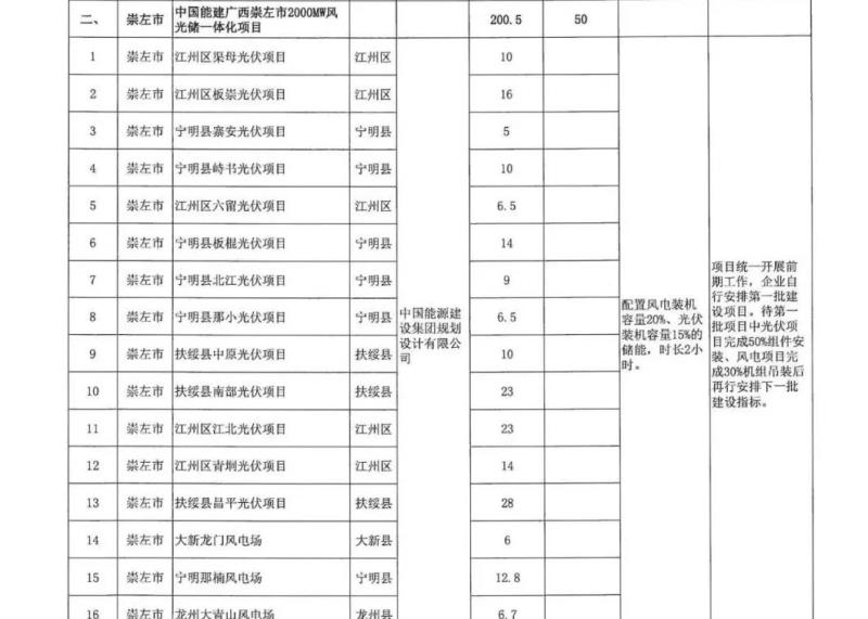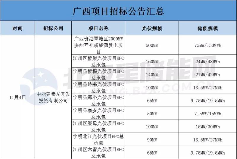 11月4日,中能建崇左開發(fā)投資有限公司連續(xù)發(fā)布9個(gè)招標(biāo)項(xiàng)目,儲(chǔ)能配置比例都為15%×2h,共配置儲(chǔ)能規(guī)模達(dá)189MW/378MWh。這9個(gè)項(xiàng)目分別是中國(guó)能建廣西貴港覃塘區(qū)2000MW多能互補(bǔ)新能源發(fā)電項(xiàng)目、江州區(qū)板崇光伏項(xiàng)目EPC總承包、寧明縣板棍光伏項(xiàng)目EPC總承包、寧明縣峙書光伏項(xiàng)目EPC總承包、寧明縣那小光伏項(xiàng)目EPC總承包、寧明縣寨安光伏項(xiàng)目EPC總承包、江州區(qū)渠母光伏項(xiàng)目EPC總承包、寧明北江光伏項(xiàng)目EPC總承包、江州區(qū)六留光伏項(xiàng)目EPC總承包。并且都位列于之前10月9日,廣西壯族自治區(qū)能源局印發(fā)《2021年市場(chǎng)化并網(wǎng)陸上風(fēng)電、光伏發(fā)電及多能互補(bǔ)一體化項(xiàng)目建設(shè)方案的通知》之中。