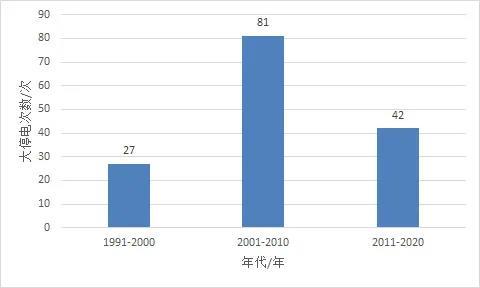 20世紀中期之后,全球電力工業(yè)進入規(guī)??焖贁U張階段,大面積停電事故對經(jīng)濟社會的影響越來越大,這緣于一方面電網(wǎng)互聯(lián)程度不斷加強,單一事故波及范圍顯著擴大;另一方面電氣化程度持續(xù)提高,大面積停電事故影響更為嚴重。綜合考慮大面積停電涉及負荷比例、影響用戶規(guī)模、停電持續(xù)時間、輿論關注度等因素,選取150次大停電事故進行相關統(tǒng)計分析如下圖所示,從時間看,大多數(shù)事故發(fā)生于2000年之后,次數(shù)為125次,占比超過80%;分區(qū)域看,北美是停電事故頻發(fā)地區(qū),其中美國發(fā)生43次,加拿大發(fā)生6次,同時巴西、印度尼西亞等發(fā)展中國家也多次發(fā)生大面積停電事故。