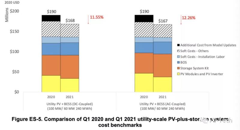 報(bào)告研究了太陽能-儲(chǔ)能項(xiàng)目的直流耦合和交流耦合配置。一個(gè)公用事業(yè)光伏+BESS系統(tǒng)(100MW光伏和60MW/240MWh BESS直流耦合)的成本從1.9億美元降至1.68億美元,降幅為11.55%。對(duì)于發(fā)電量、輸出和容量相同的交流耦合系統(tǒng),成本從1.9億美元降至1.67億美元,降幅略大,為12.26%。