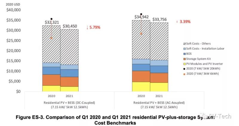 戶用獨(dú)立BESS的成本也出現(xiàn)類似的大幅下降,一個(gè)5kW/12.5kWh的系統(tǒng)下降了9.68%,但一個(gè)22組件純戶用光伏系統(tǒng)的安裝成本只下降了3.25%。直流耦合戶用太陽能-儲(chǔ)能系統(tǒng)的成本下降了5.79%,而交流耦合戶用太陽能-儲(chǔ)能系統(tǒng)的成本僅下降了3.39%。
