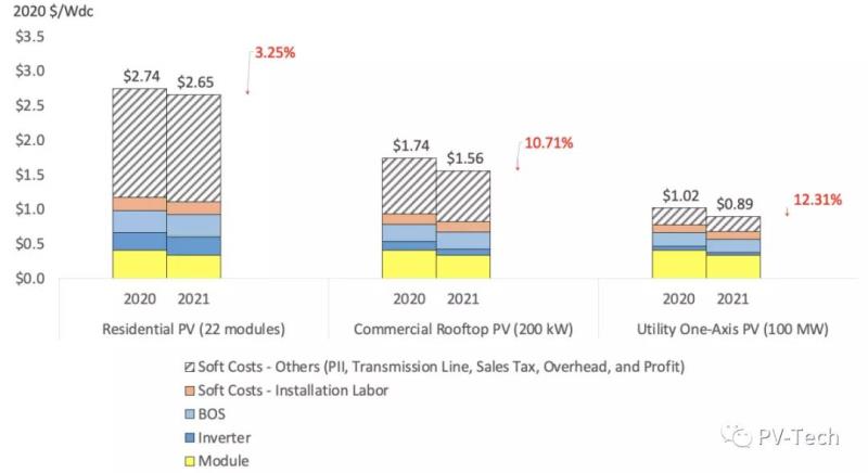 報(bào)告使用了自下而上的方法,考慮了所有系統(tǒng)和項(xiàng)目的開發(fā)成本,比較了從2020年一季度到2021年一季度各種技術(shù)的安裝成本。NREL的模型和基準(zhǔn)成本涵蓋住宅、商業(yè)和公用太陽能、太陽能+儲(chǔ)能和獨(dú)立儲(chǔ)能