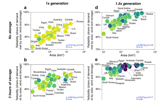 研究發(fā)現(xiàn),土地面積較大的國家和地區(qū)可以構(gòu)建可靠性更高的風(fēng)力+太陽能,電網(wǎng)。對于沒有部署儲能系統(tǒng)的電網(wǎng),土地面積每增加10倍,滿足能源需求的能力就會提高7.2%。