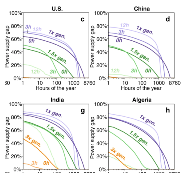 事實上,當查看上圖右下方的方框時,該方框具有12小時的電池儲能系統(tǒng)和1.5倍的標準發(fā)電量,風(fēng)力發(fā)電和太陽能發(fā)電滿足電力需求的能力使研究中分析的所有國家和國都超過了97%;有幾個國家可以滿足100%的需求。