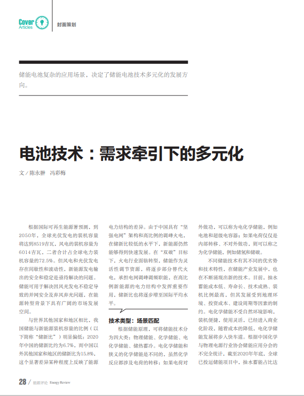 根據(jù)國際可再生能源署預(yù)測(cè),到2050年,全球光伏發(fā)電的裝機(jī)容量將達(dá)到8519吉瓦,風(fēng)電的裝機(jī)容量為6014吉瓦,二者合計(jì)占全球電力裝機(jī)容量的72.5%。但風(fēng)電和光伏發(fā)電存在間歇性和波動(dòng)性,新能源發(fā)電輸出的安全和穩(wěn)定是亟待解決的問題。儲(chǔ)能可用于解決因風(fēng)光發(fā)電不穩(wěn)定導(dǎo)致的并網(wǎng)安全及棄風(fēng)棄光問題,在能源轉(zhuǎn)型背景下具有廣闊的市場(chǎng)發(fā)展空間。