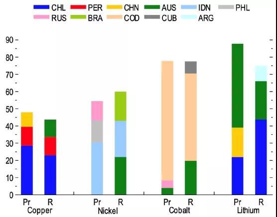 金屬供應相當集中,這意味著少數(shù)主要生產(chǎn)商可能會從中受益。在大多數(shù)情況下,產(chǎn)量最大的國家擁有最高的儲量,因此很可能是潛在的生產(chǎn)國。例如,剛果民主共和國約占全球鈷產(chǎn)量的70% ,儲量的50% (圖4)。其他在產(chǎn)量和儲量方面突出的國家包括澳大利亞(鋰、鈷和鎳);智利(銅和鋰)以及少一些的秘魯、俄羅斯、印度尼西亞和南非。