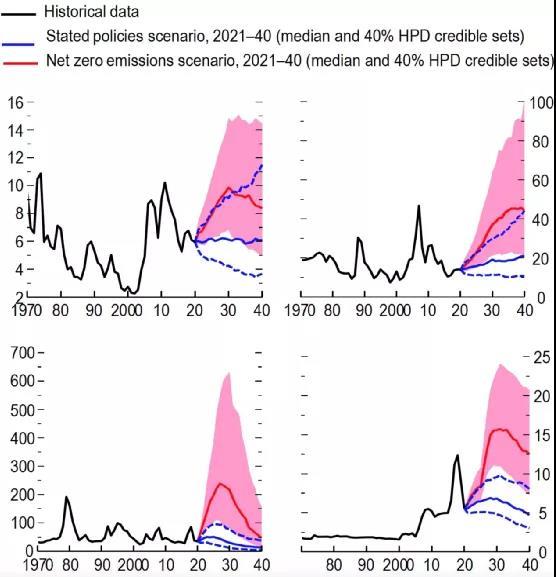 價格在2030年左右達到頂峰有兩個原因。首先,在零排放情景下,需求的急劇上升是前置的。與基于化石燃料的能源生產(chǎn)不同,可再生能源生產(chǎn)首先使用金屬—例如,建造風力渦輪機。其次,價格暴漲引發(fā)了供給增加,降低了2030年后的市場緊張程度。