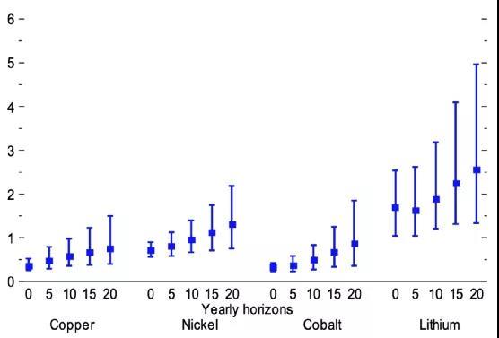 結(jié)果表明,供給在短期內(nèi)是非常缺乏彈性的,但在長期內(nèi)更有彈性(圖2)。需求引起的價格上漲10%,使銅、鎳、鈷和鋰的產(chǎn)量分別增加3.5%、7.1%、3.2%和16.9%。20年后,同樣的價格沖擊使銅產(chǎn)量提高了7.5%,鎳產(chǎn)量提高了13%,鈷產(chǎn)量提高了8.6%,鋰產(chǎn)量提高了25.5%。