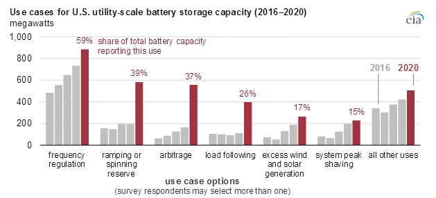 電池儲(chǔ)能系統(tǒng)最常見的用例是頻率響應(yīng)。頻率響應(yīng)是一種將電網(wǎng)頻率盡可能保持60Hz的服務(wù)。低于60Hz的偏差將會(huì)導(dǎo)致發(fā)電機(jī)保護(hù)性跳閘,從而導(dǎo)致電力系統(tǒng)穩(wěn)定性下降。電池儲(chǔ)能系統(tǒng)特別適用于頻率調(diào)節(jié),因?yàn)槠潆娏敵鍪盅杆伲译姵貎?chǔ)能系統(tǒng)可以快速吸收浪涌。到2020年底,美國(guó)總共有885MW的電池儲(chǔ)能系統(tǒng)(占公用事業(yè)規(guī)模電池儲(chǔ)能系統(tǒng)總裝機(jī)容量的59%)用于頻率響應(yīng)。