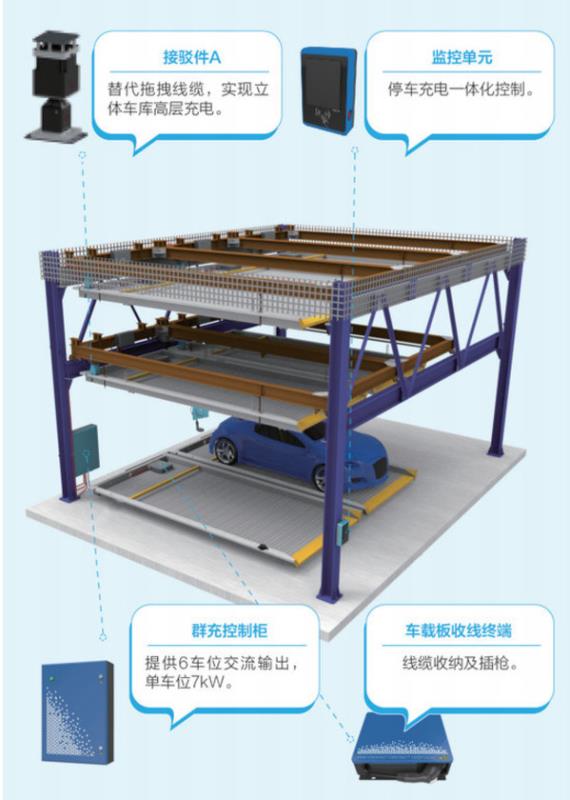 立體車庫(kù)+充電的模式,顛覆了傳統(tǒng)的充電理念,可使電動(dòng)汽車充電由平面二維向三維空間發(fā)展,使立體車庫(kù)充電模式真正落地實(shí)施,從而使多種形態(tài)的立體車庫(kù)(升降橫移、垂直升降、平面移動(dòng)、巷道堆垛等)都具備給電動(dòng)汽車規(guī)?;\嚭统潆姷哪芰?。
