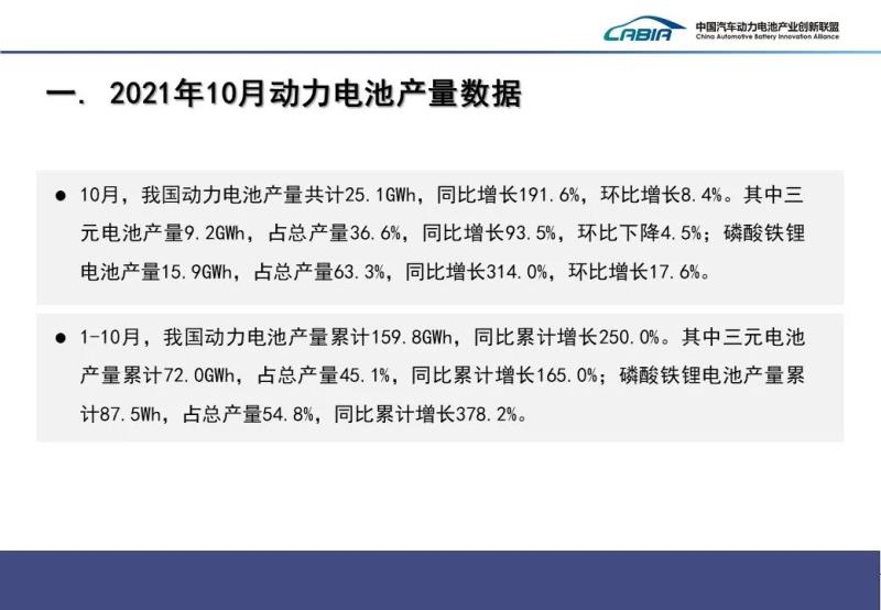 產(chǎn)量方面,2021年10月,我國(guó)動(dòng)力電池產(chǎn)量共計(jì)25.1GWh,同比增長(zhǎng)191.6%,環(huán)比增長(zhǎng)8.4%。其中三元電池產(chǎn)量9.2GWh,占總產(chǎn)量36.6%,同比增長(zhǎng)93.5%,環(huán)比下降4.5%;磷酸鐵鋰電池產(chǎn)量15.9GWh,占總產(chǎn)量63.3%,同比增長(zhǎng)314.0%,環(huán)比增長(zhǎng)17.6%。1-10月,我國(guó)動(dòng)力電池產(chǎn)量累計(jì)159.8GWh,同比累計(jì)增長(zhǎng)250.0%。其中三元電池產(chǎn)量累計(jì)72.0GWh,占總產(chǎn)量45.1%,同比累計(jì)增長(zhǎng)165.0%;磷酸鐵鋰電池產(chǎn)量累計(jì)87.5Wh,占總產(chǎn)量54.8%,同比累計(jì)增長(zhǎng)378.2%。
