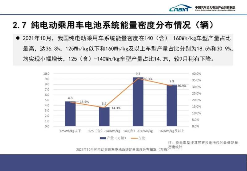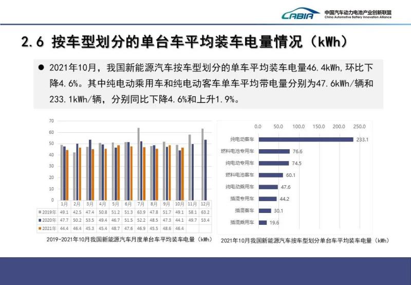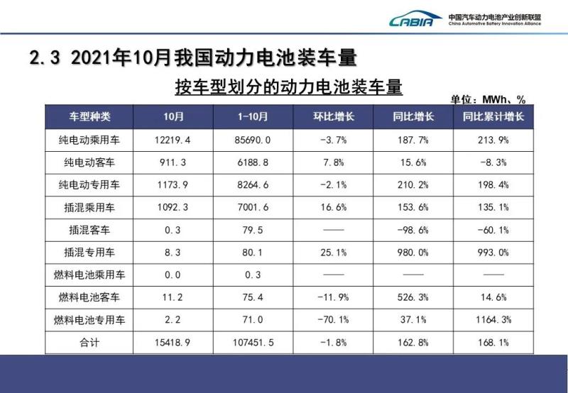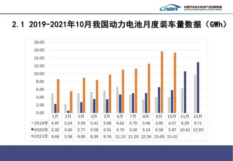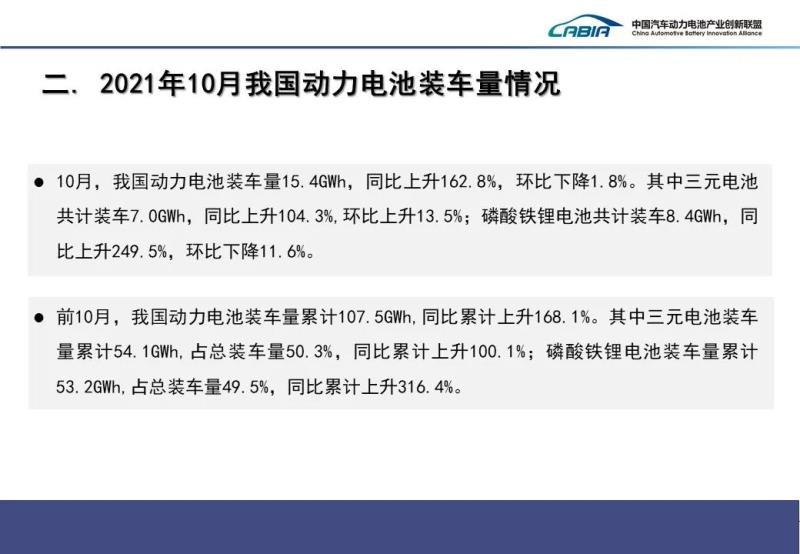 裝車量方面,2021年10月,我國(guó)動(dòng)力電池裝車量15.4GWh,同比上升162.8%,環(huán)比下降1.8%。其中三元電池共計(jì)裝車7.0GWh,同比上升104.3%,環(huán)比上升13.5%;磷酸鐵鋰電池共計(jì)裝車8.4GWh,同比上升249.5%,環(huán)比下降11.6%。1-10月,我國(guó)動(dòng)力電池裝車量累計(jì)107.5GWh,同比累計(jì)上升168.1%。其中三元電池裝車量累計(jì)54.1GWh,占總裝車量50.3%,同比累計(jì)上升100.1%;磷酸鐵鋰電池裝車量累計(jì)53.2GWh,占總裝車量49.5%,同比累計(jì)上升316.4%。