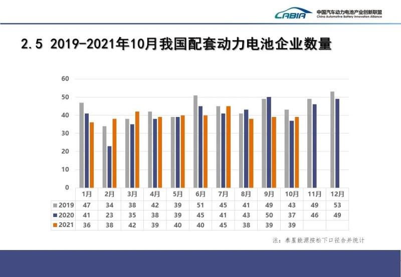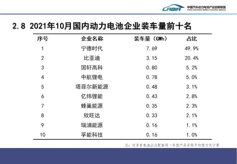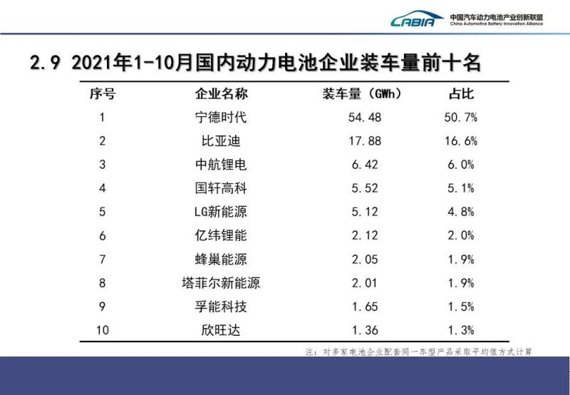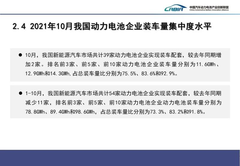 2021年10月,我國(guó)新能源汽車市場(chǎng)共計(jì)39家動(dòng)力電池企業(yè)實(shí)現(xiàn)裝車配套,較去年同期增加2家。排名前3家、前5家、前10家動(dòng)力電池企業(yè)裝車量分別為11.6GWh、12.9GWh和14.3GWh,占總裝車量比分別為75.5%、83.6%和92.9%。1-10月,我國(guó)新能源汽車市場(chǎng)共計(jì)54家動(dòng)力電池企業(yè)實(shí)現(xiàn)裝車配套,較去年同期減少11家,排名前3家、前5家、前10家動(dòng)力電池企業(yè)動(dòng)力電池裝車量分別為78.8GWh、89.4GWh和98.6GWh,占總裝車量比分別為73.3%、83.2%和91.8%。