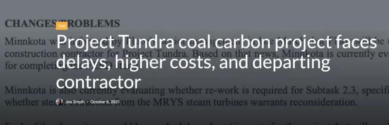 全球工程和建筑公司福陸公司(Fluor Corporation)正與明科塔電力合作社合作進(jìn)行前端工程和設(shè)計(FEED)研究,該研究主要由能源部資助。明科塔電力合作社在過去兩年向美國能源部(DOE)提交的季度報告顯示,Project Tundra成本高于預(yù)期,已經(jīng)錯過了最后開工的期限,主要承包商表示不會建造該項目。導(dǎo)致成本估算提高的原因包括修建16英里天然氣管道和為碳捕獲設(shè)施提供蒸汽的燃?xì)忮仩t的成本增加。