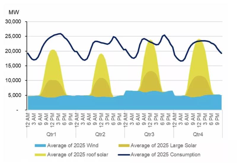 沿著頂部的深藍色線是 NEM 范圍內每天每小時的總耗電量。它下方的彩色堆疊圖代表風能(藍色)、太陽能發(fā)電場(深黃色)和屋頂太陽能系統(tǒng)(淺黃色)的平均小時輸出。