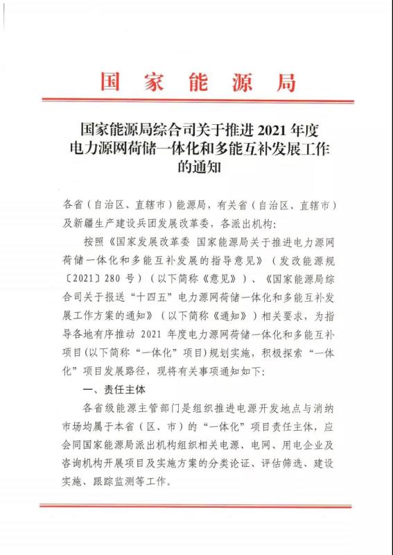 中國(guó)儲(chǔ)能網(wǎng)訊:11月10日,國(guó)家能源局綜合司下發(fā)《關(guān)于推進(jìn)2021年度電力源網(wǎng)荷儲(chǔ)一體化和多能互補(bǔ)發(fā)展工作的通知》。其中,鼓勵(lì)重大創(chuàng)新示范。各省級(jí)能源主管部門(mén)應(yīng)在確保安全的前提下,以需求為導(dǎo)向,優(yōu)先考慮含光熱發(fā)電,氫能輸儲(chǔ)用,梯級(jí)電站儲(chǔ)能、抽水蓄能、電化學(xué)儲(chǔ)能、壓縮空氣儲(chǔ)能、飛輪儲(chǔ)能等新型儲(chǔ)能示范的“一體化”項(xiàng)目。積極鼓勵(lì)“一體化”項(xiàng)目在規(guī)劃、建設(shè)、運(yùn)行各個(gè)階段實(shí)現(xiàn)統(tǒng)籌管理,充分發(fā)揮虛擬電廠調(diào)節(jié)作用,積極推進(jìn)一體化智慧聯(lián)合調(diào)控,系統(tǒng)集成管理體制和商業(yè)模式