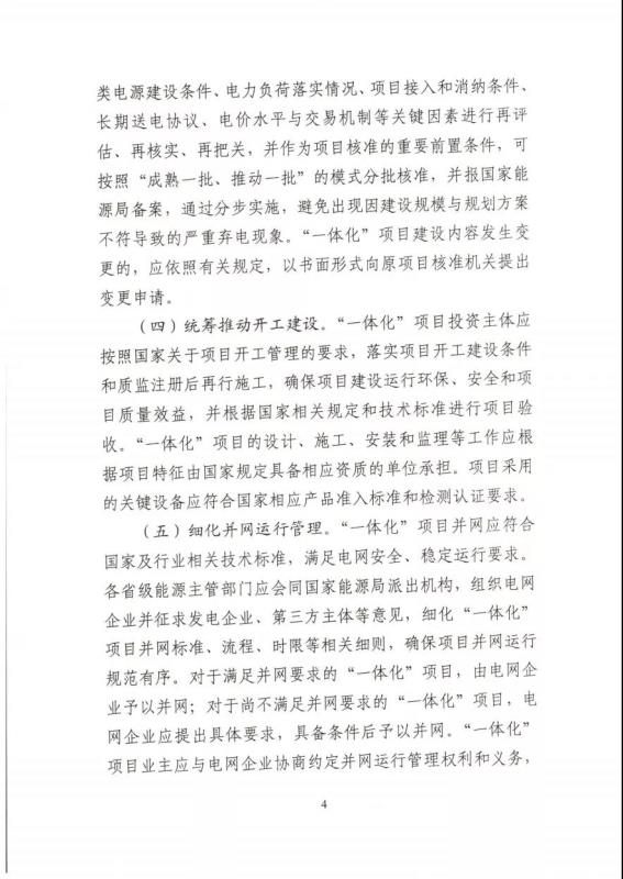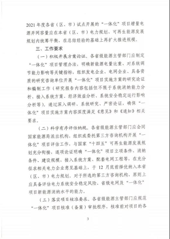 《通知》表示,各省級(jí)能源主管部門(mén)應(yīng)開(kāi)展“一體化”項(xiàng)目評(píng)估工作,與國(guó)家“十四五”可再生能源發(fā)展規(guī)劃充分銜接,逐項(xiàng)論證明確“一體化”項(xiàng)目立項(xiàng)條件、消納 條件、建設(shè)規(guī)模、接入系統(tǒng)方案、配套電網(wǎng)工程等,在充分 征求相關(guān)電力企業(yè)意見(jiàn)基礎(chǔ)上,于 12 月底前擇優(yōu)納入本省(區(qū)、市)電力規(guī)劃。