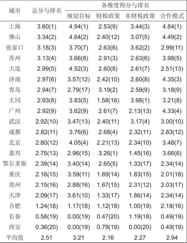 表5 20個城市燃料電池汽車政策準備度及其分維度得分與排名