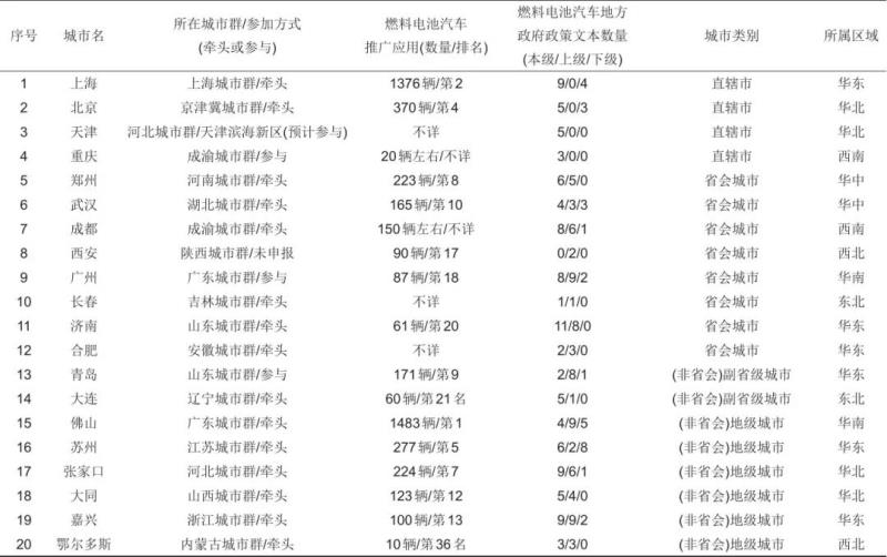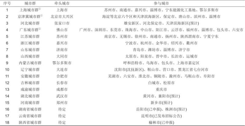 ①:上海城市群、京津冀城市群、廣東城市群于2021年8月被國家五部委(財政部、工業(yè)和信息化部、科技部、國家改革發(fā)展委、國家能源局)批準為首批燃料電池汽車示范城市群,表中為這三個城市群的牽頭及參與城市為國家實際批準的城市。