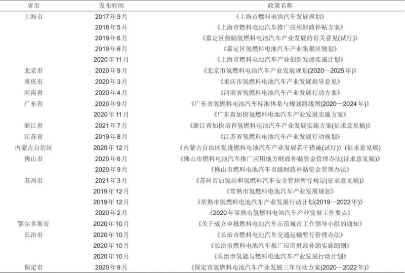 表3 20個典型城市燃料電池汽車推廣應用及政策出臺情況(2018年至2021年6月)