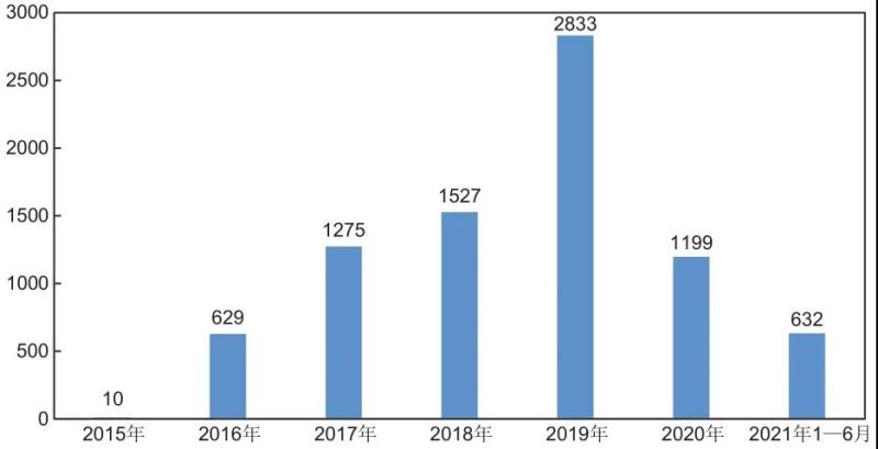 圖1 2015年至2021年6月中國燃料電池汽車年產量情況(單位:輛)