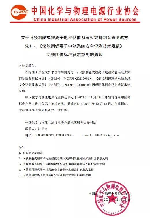 中國化學(xué)與物理電源行業(yè)協(xié)會決定于2021年11月16日開始對這兩項團體標(biāo)準(zhǔn)在網(wǎng)上進行公示并征求意見,截止時間為2021年12月12日。在此期間,企業(yè)對標(biāo)準(zhǔn)有意見和建議,請聯(lián)系: