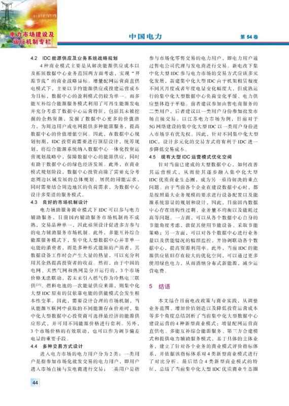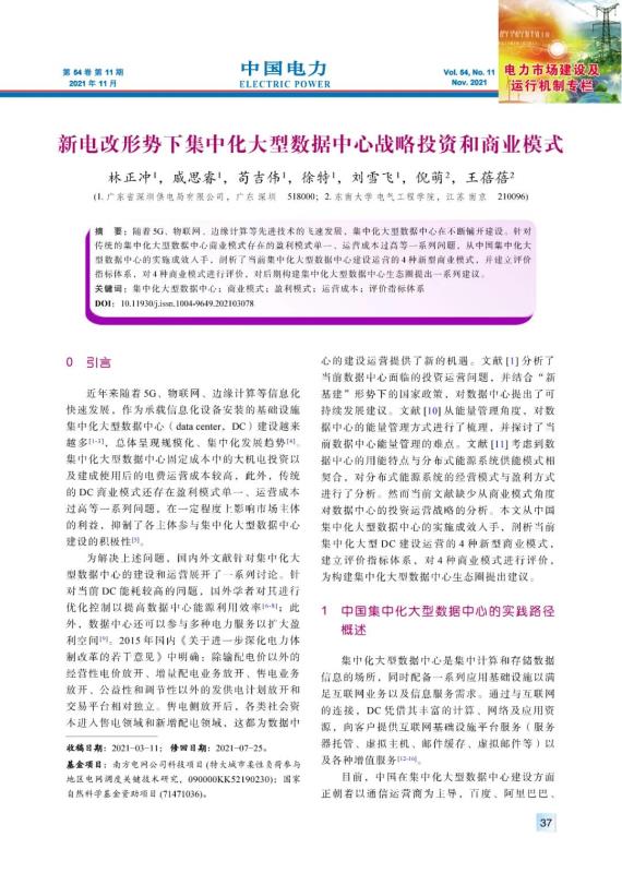 LIN Zhengchong, QI Sirui, GOU Jiwei, et al. Strategic investment and business models of large centralized data centers under the new power system reform[J]. Electric Power, 2021, 54(11): 37-46.
