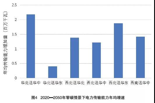 我國可再生能源資源集中分布在內(nèi)蒙古、西北、西南等地區(qū),而電力負(fù)荷的中心主要集中在華中和華東等地區(qū)。為了滿足電力供給和需求的平衡,大規(guī)模可再生能源的開發(fā)利用,必須相應(yīng)增加跨區(qū)域的電網(wǎng)傳輸能力。情景分析結(jié)果顯示,在零碳情景下,電力傳輸設(shè)施的加速建設(shè)對(duì)全國范圍電力系統(tǒng)的優(yōu)化配置有更強(qiáng)的支撐作用,尤其是在可再生能源資源豐富的華北電網(wǎng)、西北電網(wǎng)和西南電網(wǎng),其向負(fù)荷中心區(qū)的華東和華中電網(wǎng)輸送量都在全國前列,電網(wǎng)傳輸能力的年均增速也全國領(lǐng)先(圖4)。這也支撐了在零碳情景下,未來我國實(shí)現(xiàn)高比例可再生能源發(fā)電并網(wǎng)的可能。