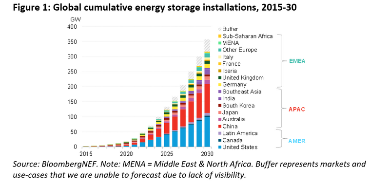 該公司在最近發(fā)布的一份名 為《全球儲能市場展望》調(diào)查報告中預(yù)測,截至2020年底,全球部署的儲能系統(tǒng)的規(guī)模為17GW/34GWh,未來十年將投資2620億美元部署345GW/999GWh的儲能系統(tǒng),到2030年累計部署量將達(dá)到358GW/1,028GWh。