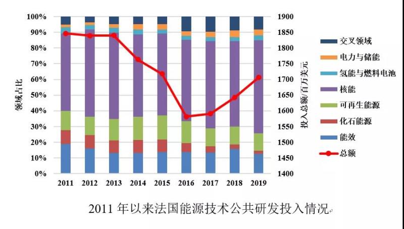 2011年至2013年,法國由于未來投資計劃的全面實施,其能源技術公共研發(fā)投入一度沖高到18億美元,隨后從2014年開始回落。從投入重點來看,法國有超過一半的研發(fā)資金投入到核能技術領域,其次是能效、可再生能源和交叉領域,化石能源領域的投入近年來顯著降低,反映出法國持續(xù)發(fā)展核能和可再生能源替代化石能源的能源戰(zhàn)略。