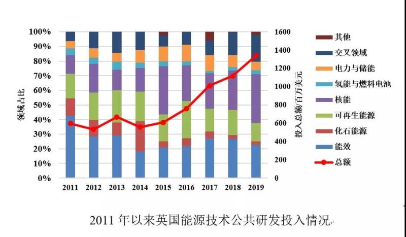 2011年以來英國能源技術公共研發(fā)投入持續(xù)增加。從研發(fā)重點來看,核能是英國投入最多的技術領域,其次是能效、交叉領域和可再生能源領域。近年來英國加大了在交叉領域的研發(fā)投入,反映了英國致力于解決能源轉(zhuǎn)型系統(tǒng)層面的跨部門跨系統(tǒng)技術挑戰(zhàn),注重能源系統(tǒng)間能量流的集成的能源發(fā)展戰(zhàn)略。