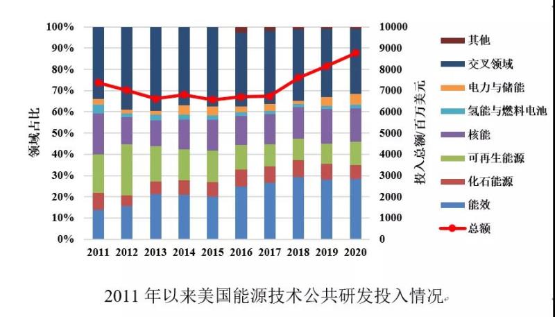 美國自2017年以來在能源技術公共研發(fā)上的投入保持增長態(tài)勢。從2011年以來的投入重點看,美國近年來加大了對能效領域的研發(fā)投入力度,而交叉領域的研發(fā)則始終是美國的投入重點。這兩個技術領域均涉及跨學科跨部門,反映了美國在能源轉(zhuǎn)型過程中對通過多學科聯(lián)合攻關、跨學科融合創(chuàng)新解決重大科技問題的重視。