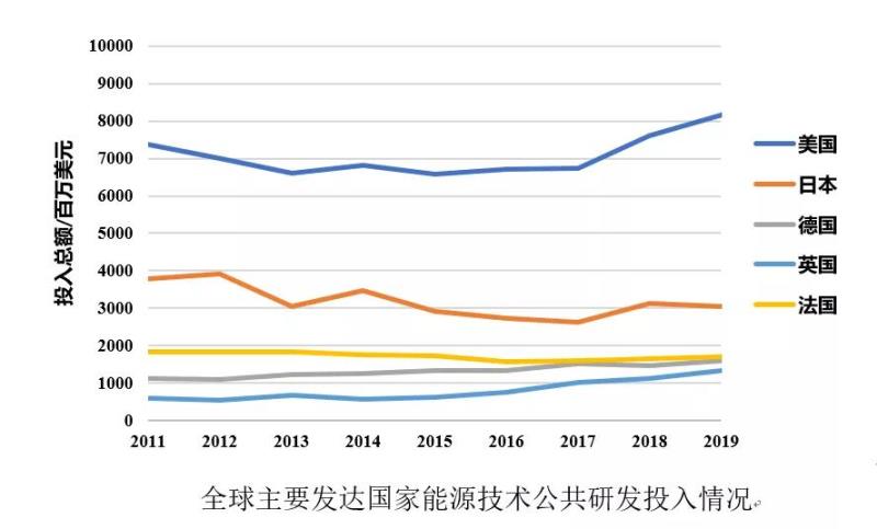 2021年5月,國際能源署(IEA)發(fā)布了世界范圍內(nèi)主要國家公共研發(fā)投入(政府主導的科研投入)的統(tǒng)計情況。根據(jù)統(tǒng)計數(shù)據(jù)顯示,主要發(fā)達國家中美國和日本的能源技術公共研發(fā)投入長期領先。2019年美國和日本的研發(fā)投入總額分別超過80億美元和30億美元,遠高于其他國家。分領域來看,美國在除核能以外技術領域的公共研發(fā)投入均領先于其他國家,而日本則是在核能技術領域投入最多的國家。