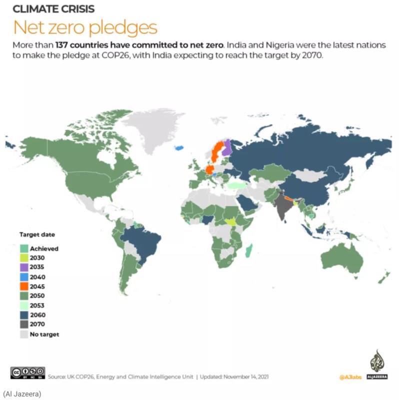 中國儲能網(wǎng)訊:為了保持目標(biāo)在可實現(xiàn)范圍內(nèi),到2030年全球排放量需要比2010年減少45%。為此,在COP26上各國為應(yīng)對氣候變化作出了新的承諾。半島電視臺制作了圖表,綜述各國在停止砍伐森林、逐步淘汰煤炭、減少甲烷排放、凈零排放的承諾。