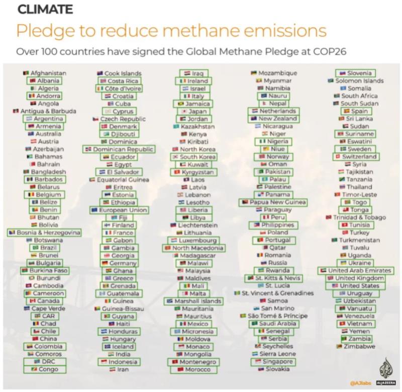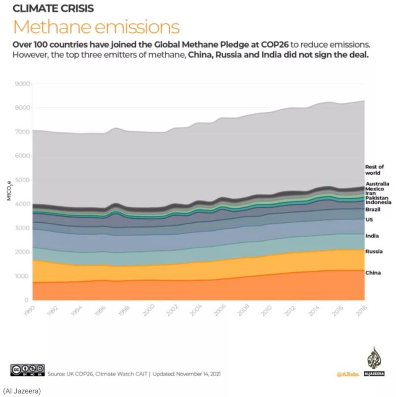 甲烷是比二氧化碳更強(qiáng)大的溫室氣體,因為它能在大氣中蓄熱。然而,甲烷排放量最大的三個國家——中國、俄羅斯和印度——沒有簽署甲烷減排承諾。