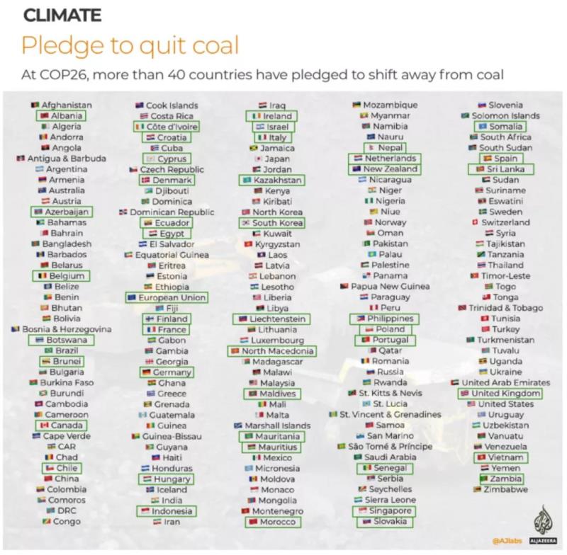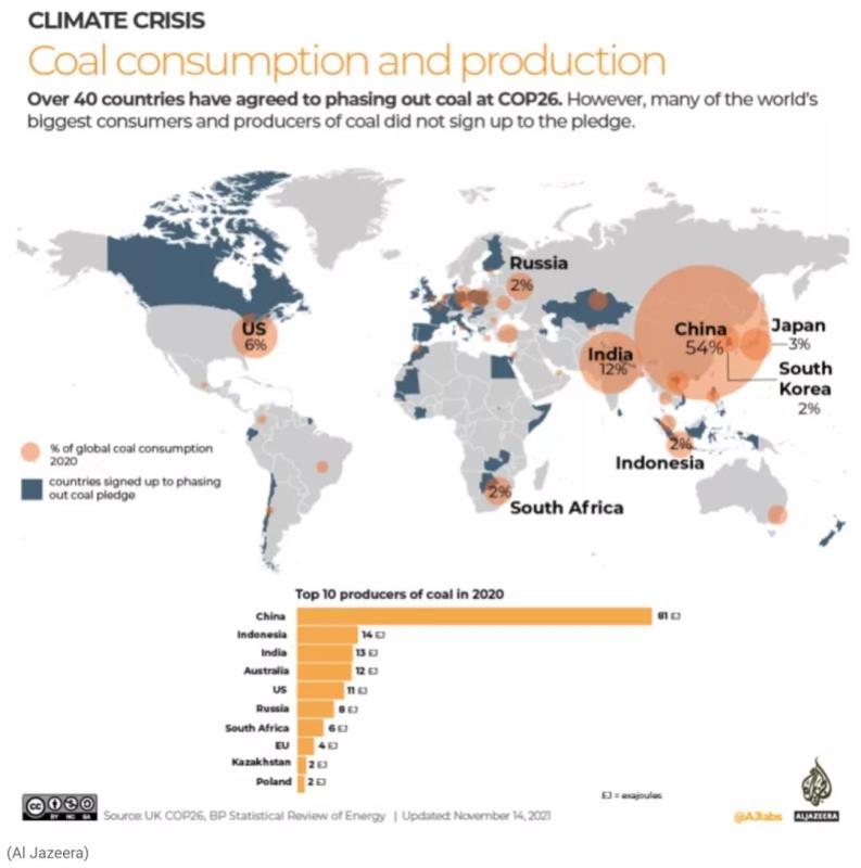 全球40多個國家同意逐步停止使用煤電,23個國家簽署了COP26煤電向清潔能源過渡協(xié)議,承諾停止建設(shè)和發(fā)放新煤電廠的許可證,主要國際銀行還承諾在2021年底前結(jié)束對新煤電的國際公共融資。然而,一些最大的煤炭生產(chǎn)國和消費(fèi)國沒有加入該協(xié)議,包括中國(去年占全球煤炭消費(fèi)量的54%)。其他明顯缺席的國家還有印度、美國和澳大利亞,它們與中國一起占全球煤炭消費(fèi)量的近四分之三。