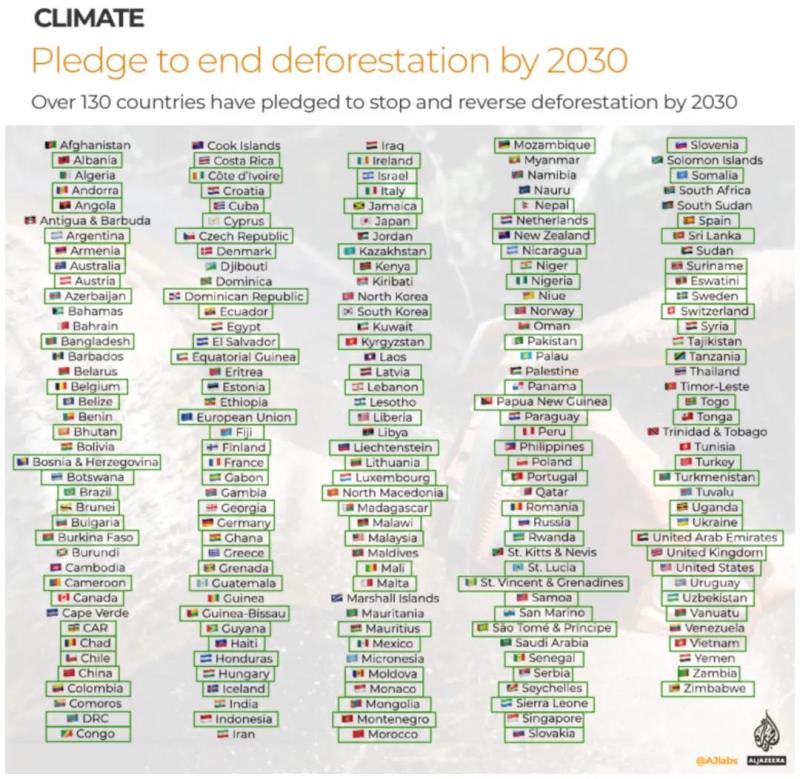 140多個國家同意在未來十年內(nèi)停止全球森林砍伐。該協(xié)議是峰會達(dá)成的第一項重大協(xié)議,包括192億美元的公共和私人資金承諾。簽署國中有俄羅斯和巴西,這兩個國家占世界森林面積的30%以上。但印度、玻利維亞和委內(nèi)瑞拉沒有參加該協(xié)議,它們都屬于森林覆蓋土地面積比例最大的前20個國家。