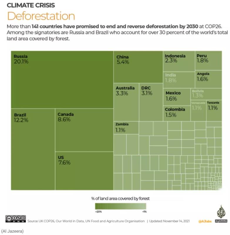 由于森林中儲存的碳被釋放回大氣,土地清理導(dǎo)致溫室氣體排放。COP26領(lǐng)導(dǎo)人通過森林和土地利用的宣言,旨在保護(hù)和恢復(fù)森林。