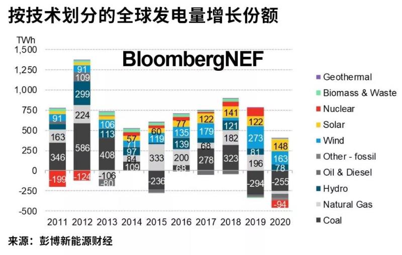 2020年光伏發(fā)電量增幅達到歷史新高,比2019年增加了148TWh。在新增發(fā)電量中,光伏和風電占311TWh,份額約為77.5%,而化石燃料減少了362TWh。