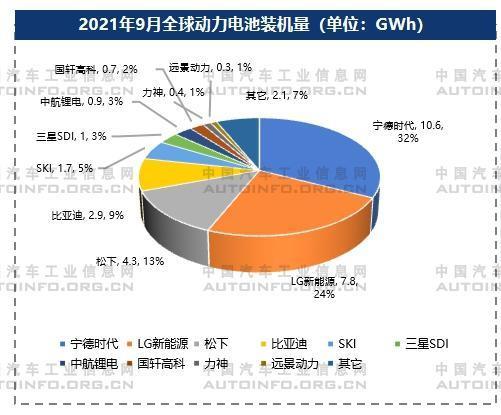 SNE Research發(fā)布的數(shù)據(jù)顯示,2021年9月,全球電動(dòng)車電池裝機(jī)量約為32.9 GWh,同比增長(zhǎng)近一倍(94%)。在9月全球動(dòng)力電池裝機(jī)量Top 10榜單中,中國(guó)有六家電池制造商上榜,分別是寧德時(shí)代、比亞迪、中航鋰電、國(guó)軒高科、力神和遠(yuǎn)景動(dòng)力,占總市場(chǎng)份額的48%。其中,寧德時(shí)代仍居榜首,力神擠掉了蜂巢能源,位列第9。