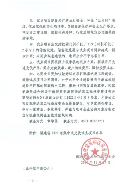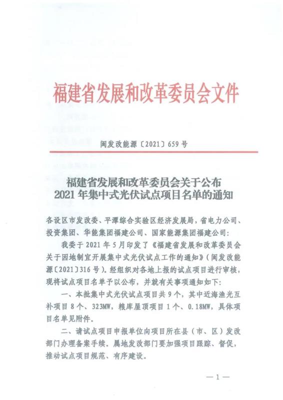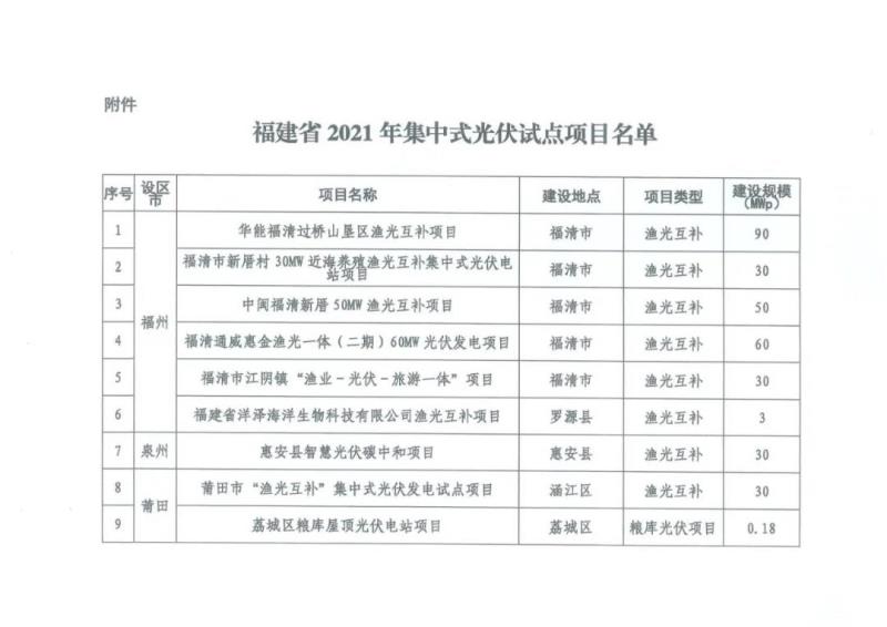 中國(guó)儲(chǔ)能網(wǎng)訊:11月17日,福建省發(fā)展和改革委員會(huì)公布了《2021年集中式光伏試點(diǎn)項(xiàng)目名單》的通知。本批集中式光伏試點(diǎn)項(xiàng)目共9個(gè),其中近海漁光互補(bǔ)項(xiàng)目8個(gè),規(guī)模323MW,糧庫(kù)屋頂項(xiàng)目1個(gè),規(guī)模0.18MW。試點(diǎn)項(xiàng)目分別建設(shè)在福州、泉州、莆田三地。具體名單如下: