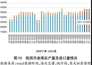 一是在煤炭供應(yīng)上,釋放煤炭產(chǎn)能。9月底以來允許153座煤礦核增產(chǎn)能2.2億噸/年,相關(guān)煤礦已陸續(xù)按核定產(chǎn)能生產(chǎn),四季度可增產(chǎn)5000萬噸以上。將具備安全生產(chǎn)條件的38座建設(shè)煤礦列入應(yīng)急保供煤礦,允許階段性釋放產(chǎn)能,合計(jì)產(chǎn)能1億噸/年。為60余座煤礦辦理接續(xù)用地手續(xù),確保1.5億噸/年以上產(chǎn)能穩(wěn)定釋放。10月19日國(guó)家發(fā)改委在煤電油氣運(yùn)重點(diǎn)企業(yè)保供穩(wěn)價(jià)座談會(huì)上指出,10月18日的日產(chǎn)量已超過1160萬噸,創(chuàng)今年新高,力爭(zhēng)煤礦日產(chǎn)量達(dá)到1200萬噸以上。據(jù)國(guó)家統(tǒng)計(jì)局,9月國(guó)內(nèi)生產(chǎn)原煤3.3億噸,日均產(chǎn)量1113萬噸,第四季度可增產(chǎn)5500萬噸,即日均增產(chǎn)60萬噸,達(dá)到1173萬噸,在產(chǎn)能有效釋放的情況下,10~12月月產(chǎn)量3.5億噸~3.6億噸,疊加月進(jìn)口量0.3億噸,不考慮38座新增應(yīng)急保供煤礦1億噸/年,四季度月度供給量在3.8~3.9億噸,與2020年12月用煤高峰基本持平(見圖10)。
