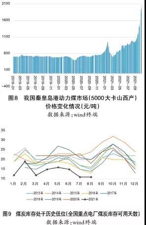 今年全球大宗商品價(jià)格暴漲,加之國(guó)內(nèi)用能需求猛增,地方政府能耗雙控壓力較大,煤炭供應(yīng)不足,煤價(jià)快速上漲,9月動(dòng)力煤期貨現(xiàn)貨都推升至1400元/噸以上,10月企業(yè)動(dòng)力煤現(xiàn)貨快速突破歷史極值,多地突破了2000元/噸。因?yàn)槊禾績(jī)r(jià)格地區(qū)差異較大,各地燃煤上網(wǎng)電價(jià)也與煤炭資源稟賦和運(yùn)輸成本關(guān)系較大。就東部沿海省份而言,煤電上網(wǎng)基準(zhǔn)價(jià)在0.4~0.45元/千瓦時(shí)之間,當(dāng)前平均不含稅上網(wǎng)電價(jià)為0.36元/千瓦時(shí)。從成本考慮,綜合考慮折舊0.05元/千瓦時(shí),人工及運(yùn)維0.05元/千瓦時(shí),財(cái)務(wù)費(fèi)用0.02元/千瓦時(shí),管理費(fèi)用0.01元/千瓦時(shí),測(cè)算燃料成本、煤炭?jī)r(jià)格與企業(yè)盈虧的關(guān)系:一是如果燃料成本超過0.26元/千瓦時(shí)(含稅),對(duì)應(yīng)5500大卡動(dòng)力煤入爐價(jià)格680元/噸,預(yù)計(jì)多數(shù)企業(yè)將僅能夠維持盈虧平衡。二是如果燃料成本超過0.33元/千瓦時(shí)(含稅),對(duì)應(yīng)5500大卡動(dòng)力煤入爐價(jià)格864元/噸,預(yù)計(jì)多數(shù)企業(yè)將出現(xiàn)虧損現(xiàn)金成本,企業(yè)將沒有動(dòng)力從事電力生產(chǎn),在我國(guó)電網(wǎng)強(qiáng)制性考核機(jī)制下,一些電廠被迫報(bào)非停避免損失或者因?yàn)闆]錢買煤而停產(chǎn)。此外,我國(guó)電力現(xiàn)貨仍處于試點(diǎn)階段,煤電企業(yè)主要簽訂的年度、月度售電合同,電價(jià)無法隨著煤價(jià)的快速變化而調(diào)整,電價(jià)往下游傳導(dǎo)有限(見圖8、圖9)。