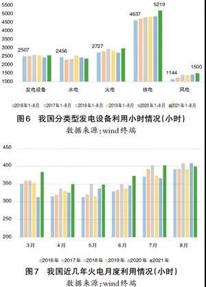 從各發(fā)電類型看,核電、風(fēng)電利用小時(shí)均創(chuàng)新高,特別是核電。在用電增長(zhǎng)的情況下,2021年1~8月核電利用小時(shí)比去年同期提高了338個(gè)小時(shí),達(dá)到5219小時(shí),充分發(fā)揮了基荷保障作用。風(fēng)電利用小時(shí)在2021年前8個(gè)月達(dá)到1500小時(shí),連續(xù)幾年保持增長(zhǎng),風(fēng)電利用率持續(xù)攀升。我國(guó)四川和云南是對(duì)水力發(fā)電貢獻(xiàn)最大的省份,占全國(guó)水電發(fā)電總量接近50%,2021年以來,云南和四川部分地區(qū)降水量較往年并不算很充裕,水電受西南地區(qū)來水減少導(dǎo)致利用小時(shí)連續(xù)三年下降。作為供電主體的火電,在全國(guó)多省市出現(xiàn)拉閘限電、其他發(fā)電類型受阻的情況下,利用小時(shí)增長(zhǎng)有限(見圖6、圖7)。