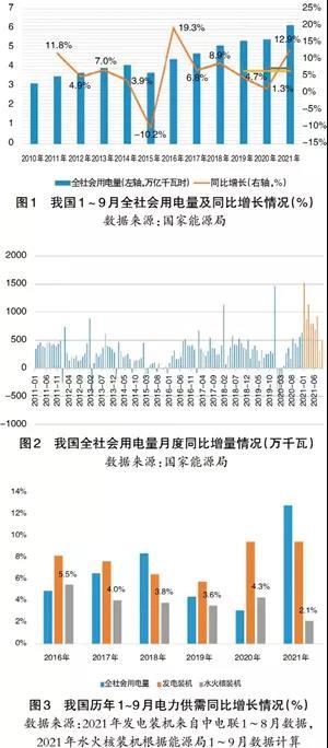 1~9月全社會(huì)用電量累計(jì)61651億千瓦時(shí),同比增長(zhǎng)12.9%,比2020年提高了11.6個(gè)百分點(diǎn)。鑒于2020年受疫情影響,2020~2021年兩年年均增速7.4%,2019~2021年三年年均增速6.5%,基本上與2017年(6.8%)、2018年(8.9%)持平,但疫情導(dǎo)致近兩年用電負(fù)荷波動(dòng)較大。從增量看,2021年1~7月每個(gè)月同比增量均較多,創(chuàng)下近幾年新高。8~9月有所緩和,主要受三季度大規(guī)模拉閘限電影響。電力需求增長(zhǎng)過快導(dǎo)致供給增長(zhǎng)相對(duì)不足,2021年1~8月我國(guó)電源裝機(jī)同比增長(zhǎng)9.5%,但是火電、核電、水電等穩(wěn)定供應(yīng)電源裝機(jī)同比增長(zhǎng)2.1%,低于近幾年數(shù)據(jù),在風(fēng)光出力受阻情況下,電力保障存在較大壓力(見圖1、圖2、圖3)。