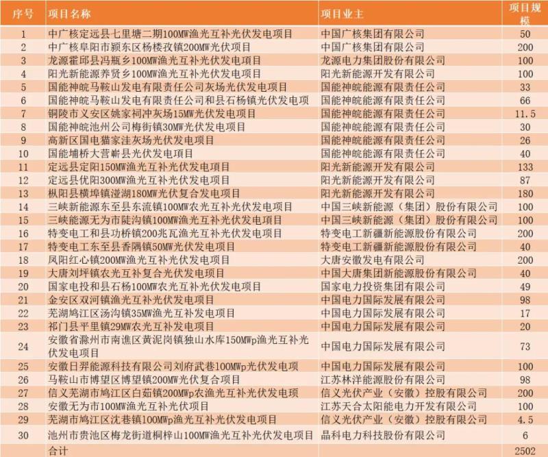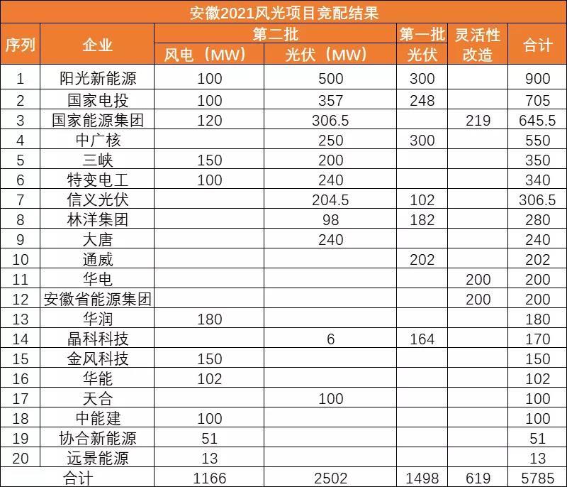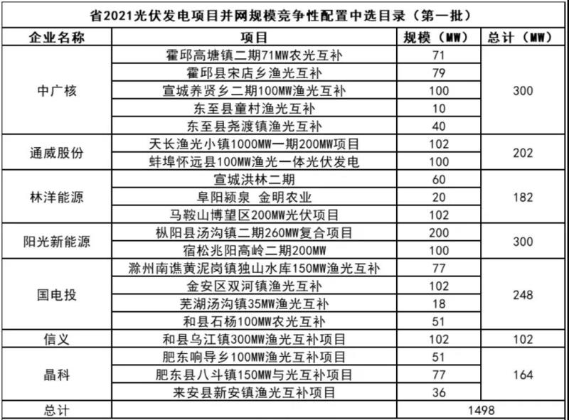此前10月21日,安徽省能源局下發(fā)《2021年光伏發(fā)電項目并網(wǎng)規(guī)模競爭性配置(第一批次)中選公告》,規(guī)模共計1498MW。中廣核、陽光新能源、國家電投、通威、林洋、晶科、信義光能等7家企業(yè)中標20個光伏第一批優(yōu)選項目。加上此次安徽省總共公示了4GW光伏、1.166GW風電項目。