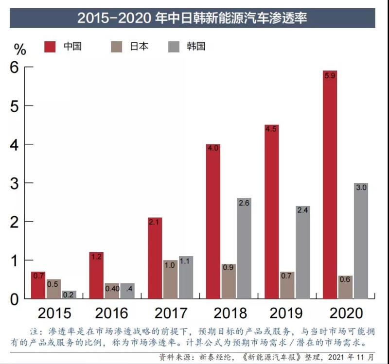 有數(shù)據(jù)顯示,2015年,中國新能源汽車滲透率為0.7%,韓國為0.2%,日本為0.5%;而到2020年,中國新能源汽車滲透率升為5.9%,韓國為3.0%,日本為0.9%,位居倒數(shù)第一。